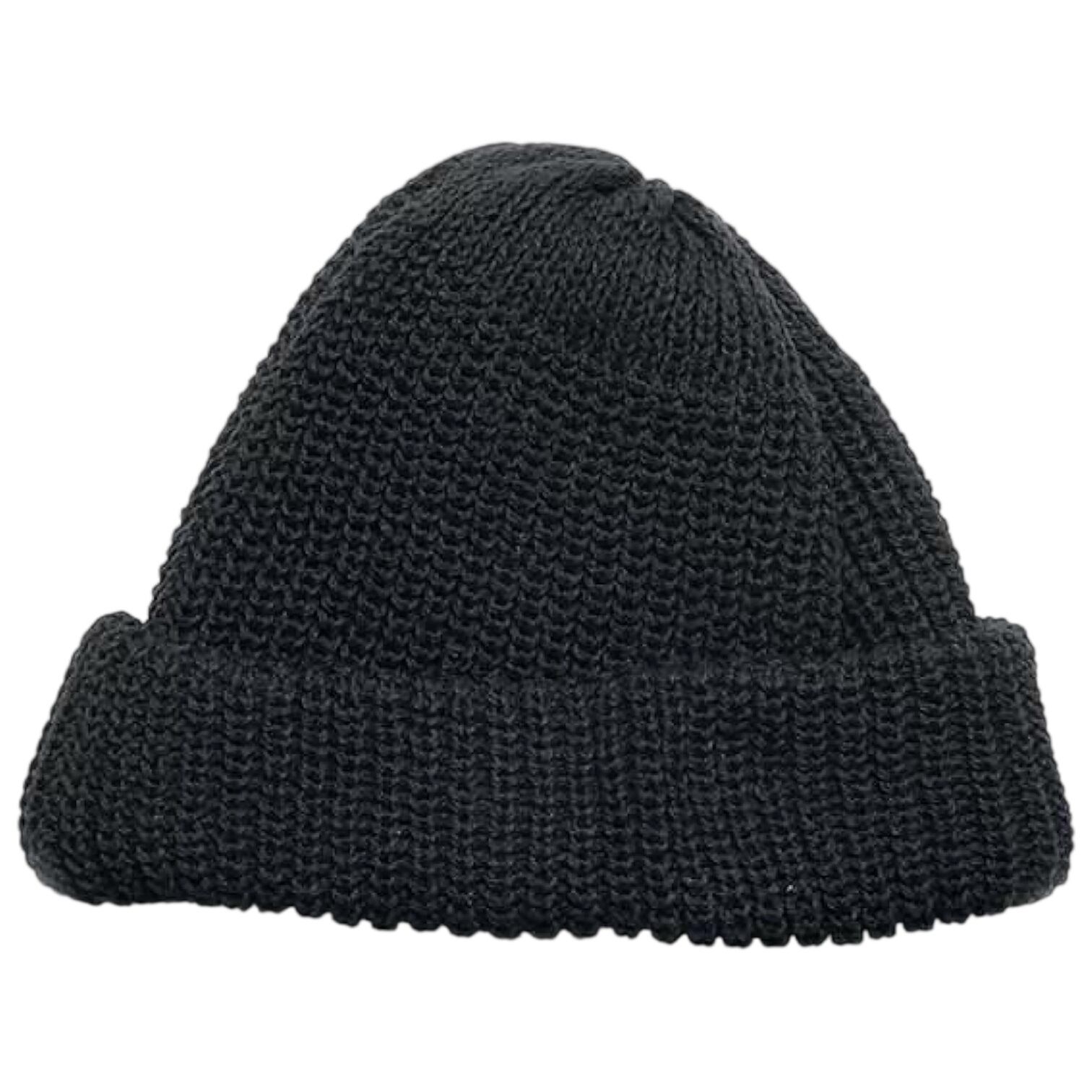 ヴァージンコットンの落ち綿(未利用繊維)100%の糸をベースに、リブ編みで編まれたショート丈のワッチキャップ。