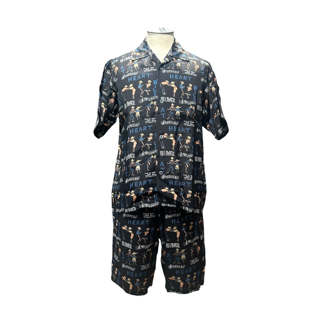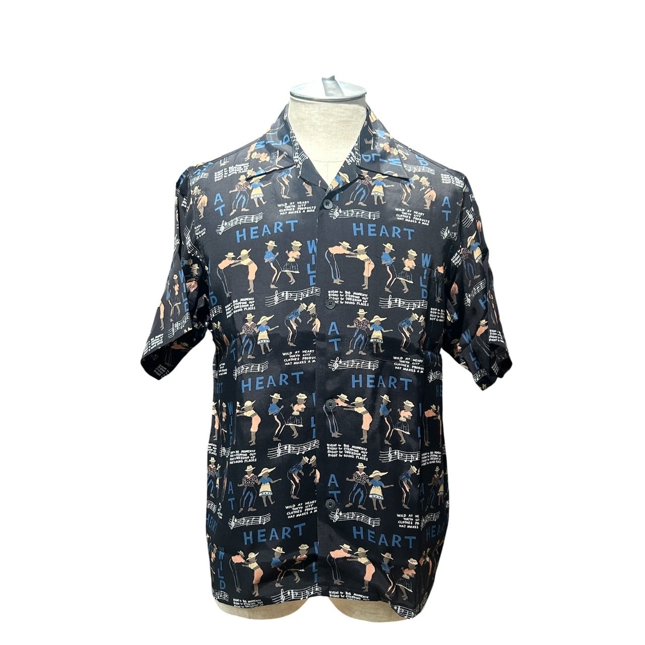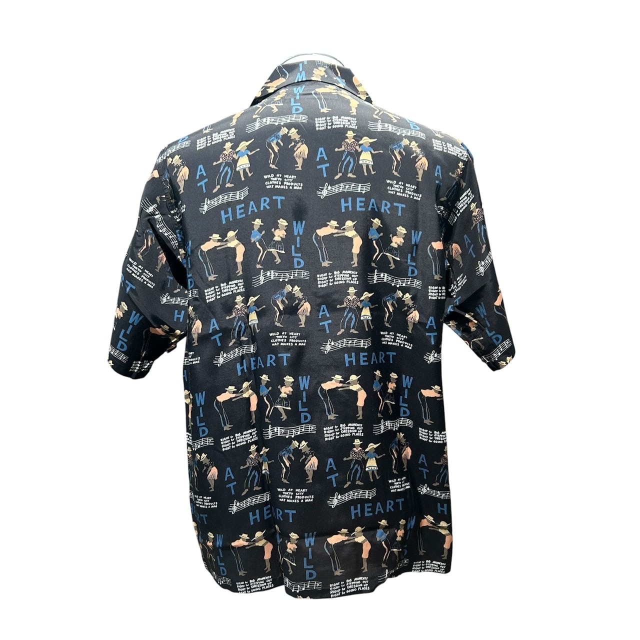 踊る男女と “WILD AT HEART” ロゴを落とし込んだ、遊び心あふれる総柄レーヨンシャツ。