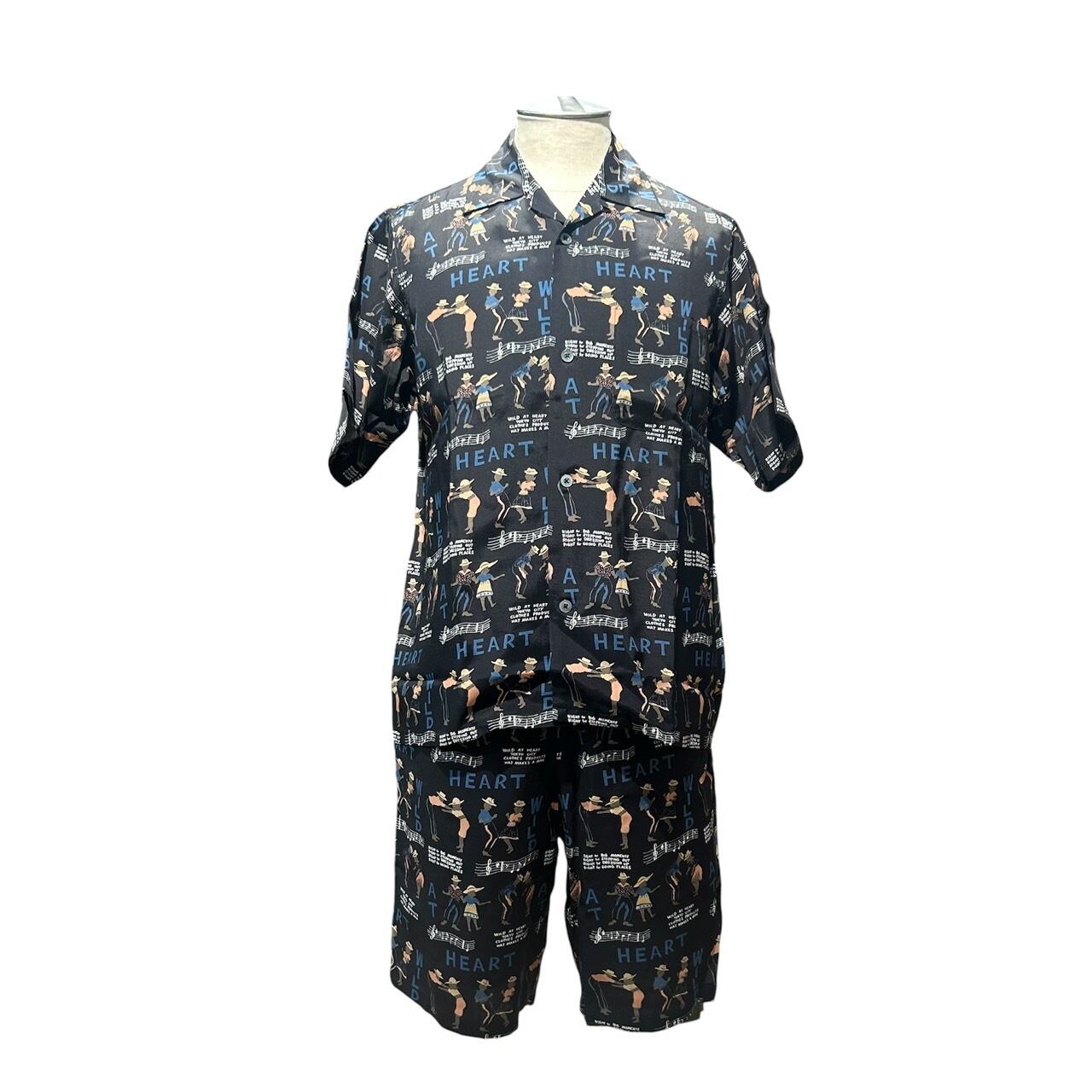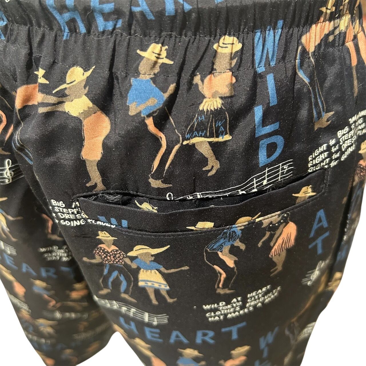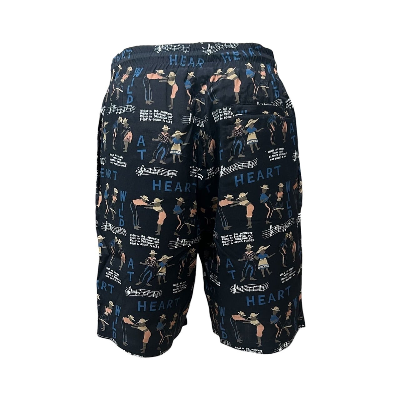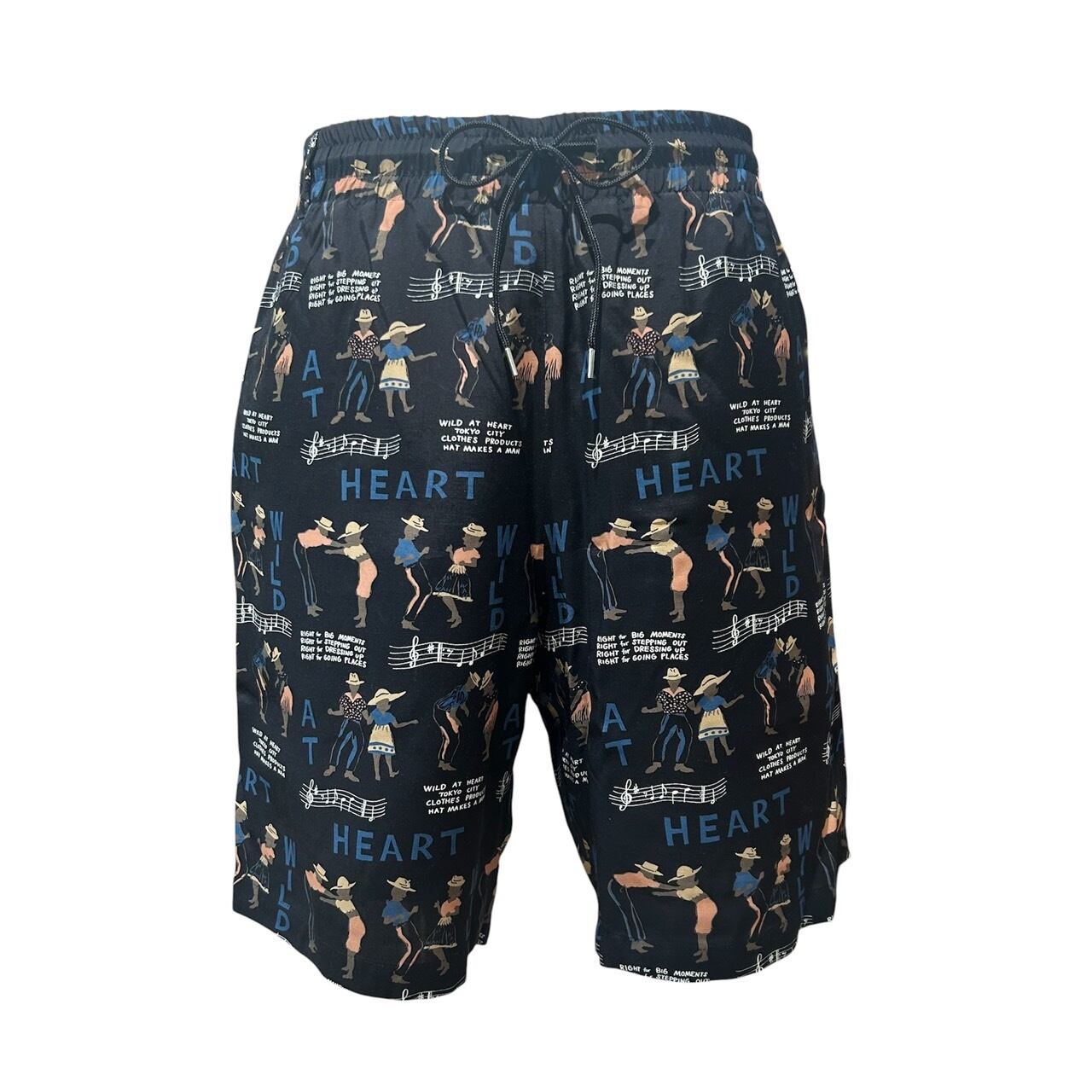 踊る男女のグラフィックと “WILD AT HEART” ロゴを落とし込んだ、遊び心あふれる総柄レーヨンショーツ。
