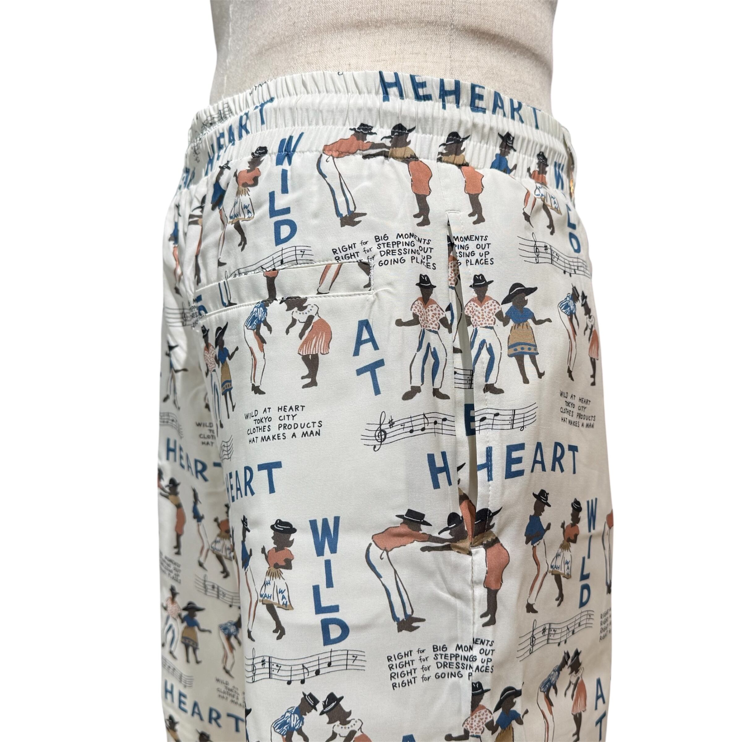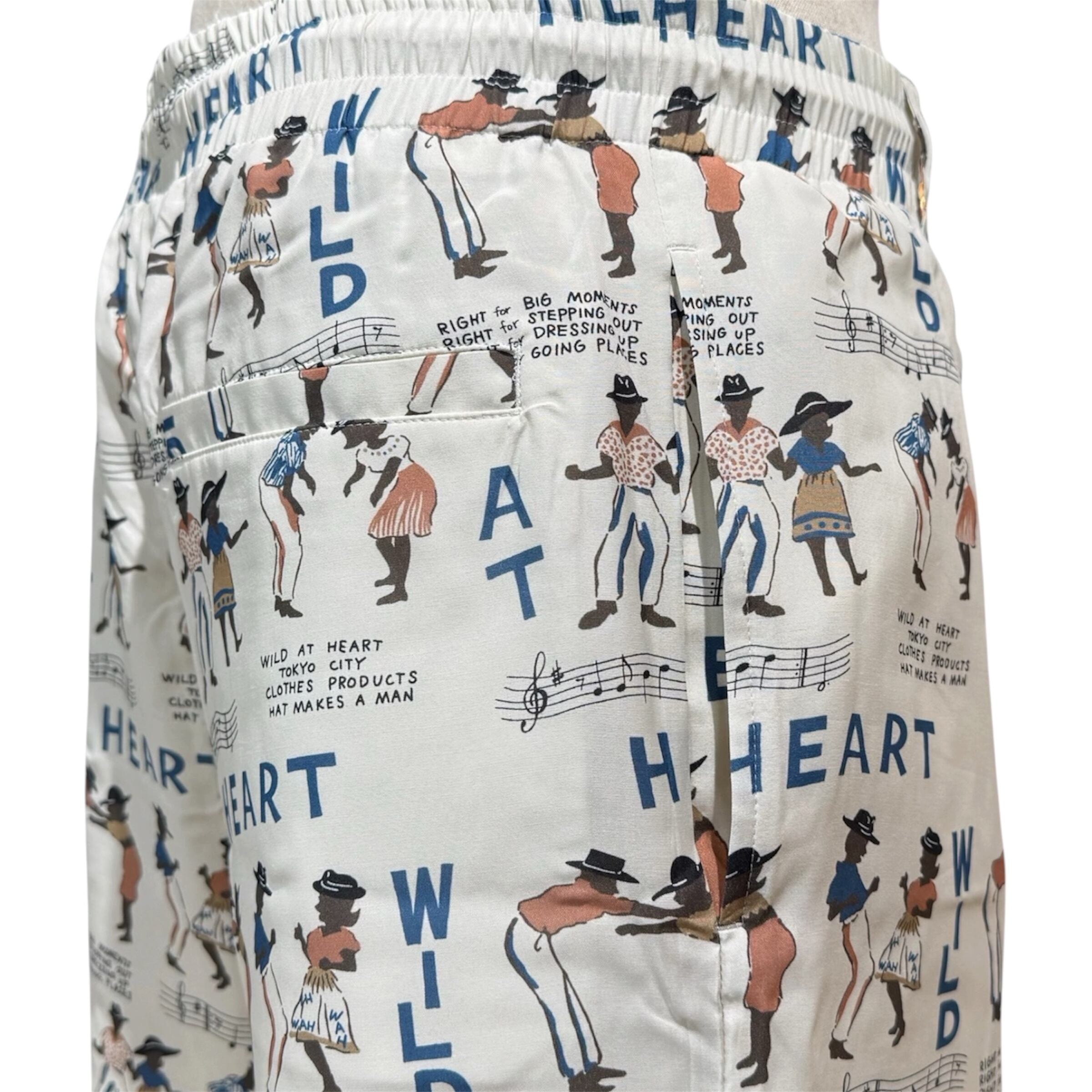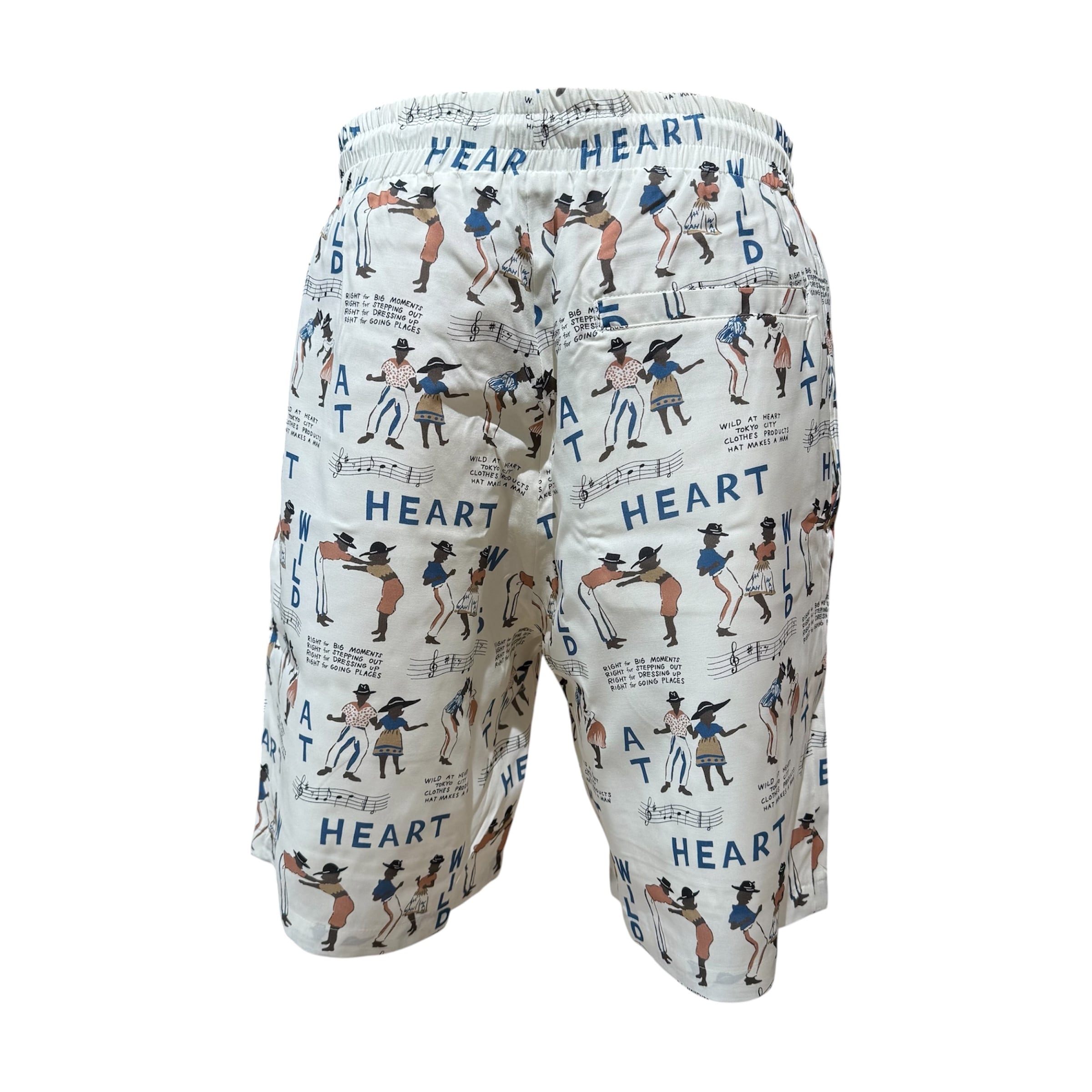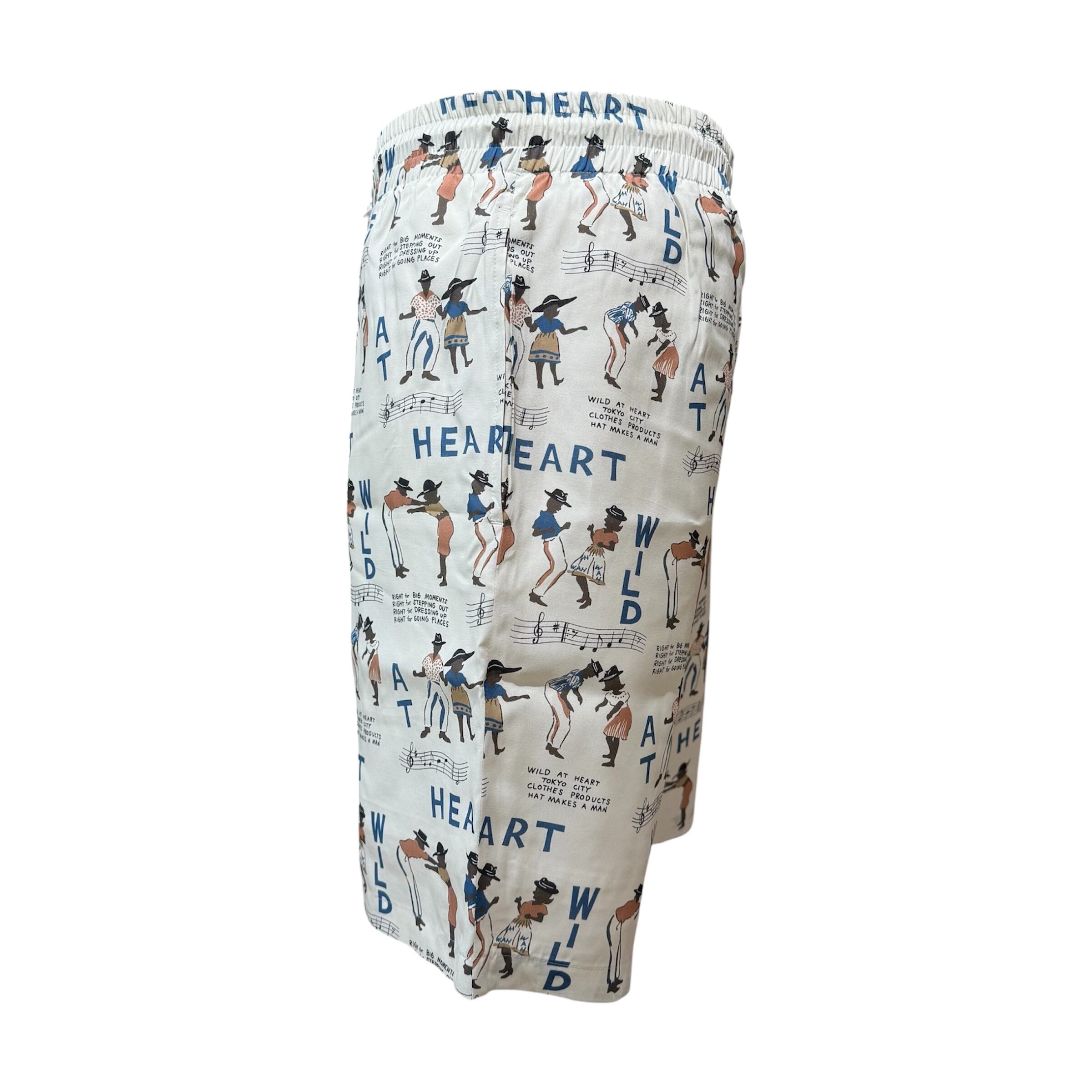 踊る男女のグラフィックと “WILD AT HEART” ロゴを落とし込んだ、遊び心あふれる総柄レーヨンショーツ。