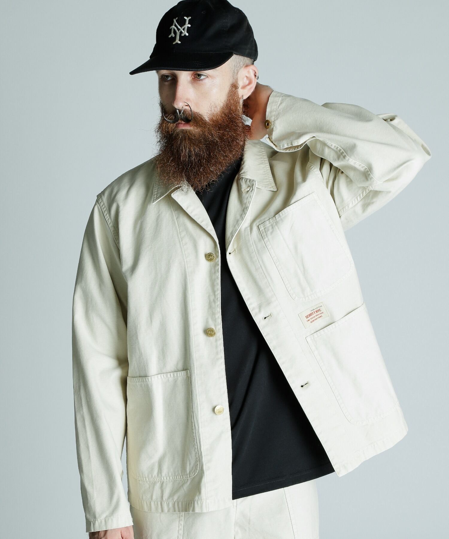 マットで粗野感が特徴的なバックサテン生地に、独特の風合いや色ムラが楽しめる製品染めで仕上げた一着です。